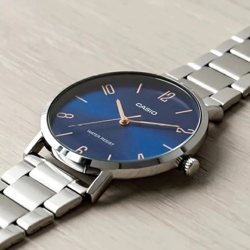 Experience refined style with the Casio MTP-VT01D-2B2. The slim case design hugs the wrist comfortably, while the striking blue dial and gold markers create a look that’s both modern and classic. Crafted with a durable, ion-plated stainless steel bracelet, this watch is built to last. Powered by a reliable Japan Quartz movement and supported by a 12-month warranty, it’s the perfect choice for the discerning gentleman.
