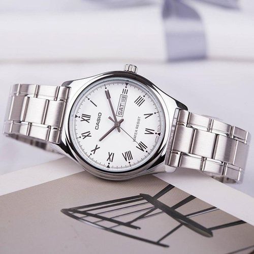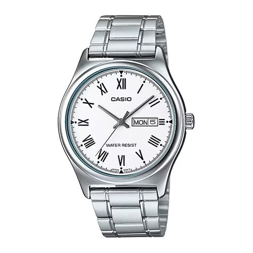 The Casio MTP-V006D-7B is more than just a watch; it’s a style statement. This refined timepiece seamlessly transitions from boardroom to weekend, thanks to its elegant blend of a white dial with Roman numerals, a silver case, and a glossy stainless steel bracelet.